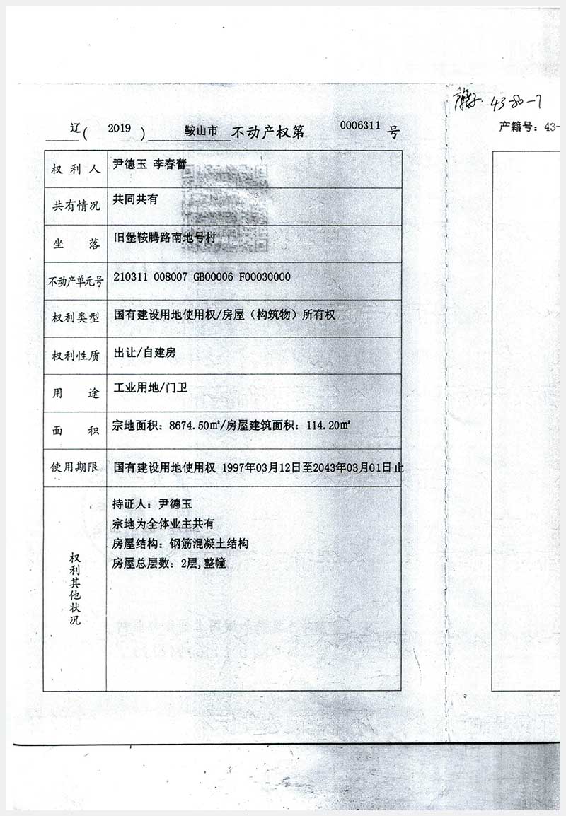 126号 鞍山市旧堡鞍腾路南地号村房产及土地使用权